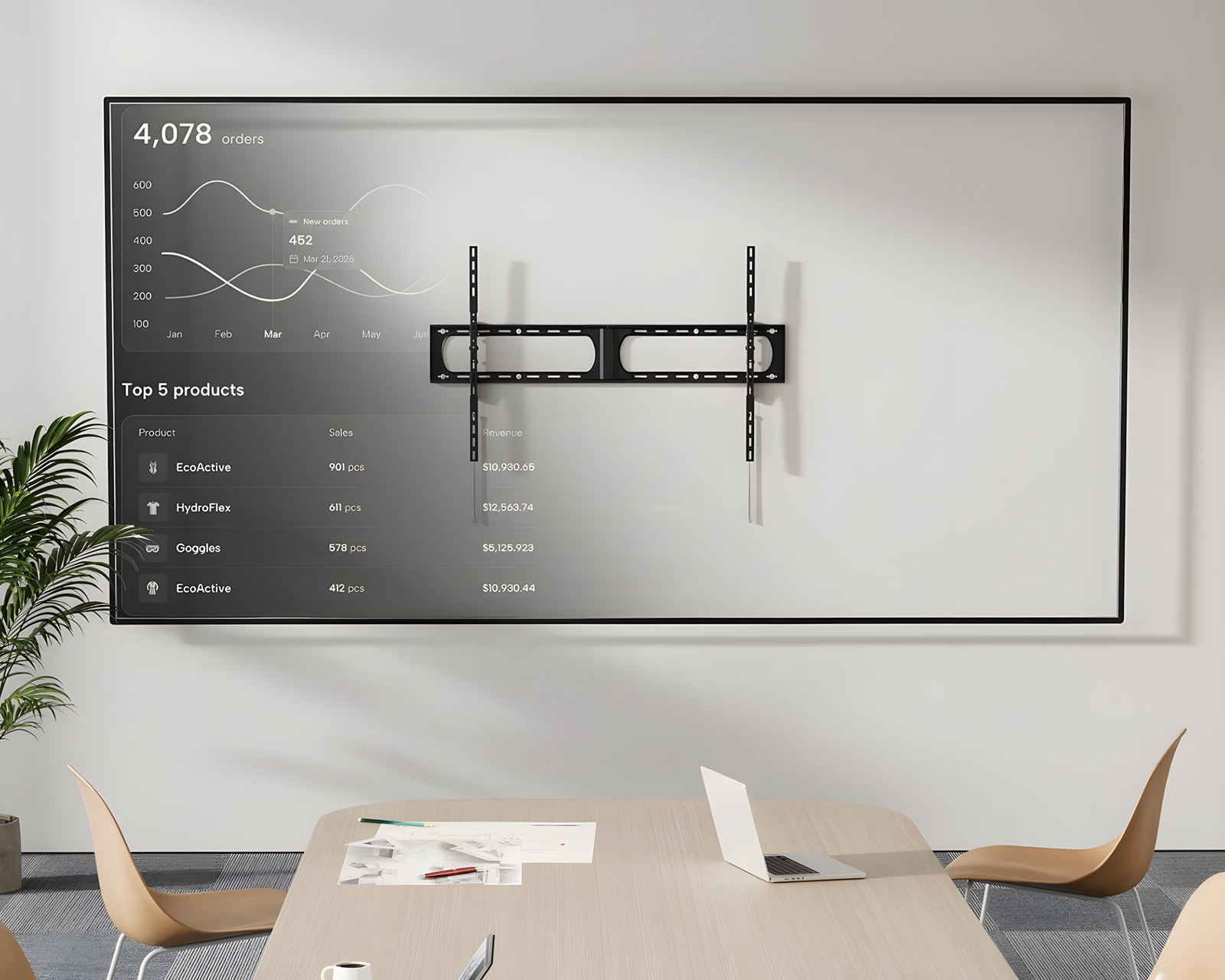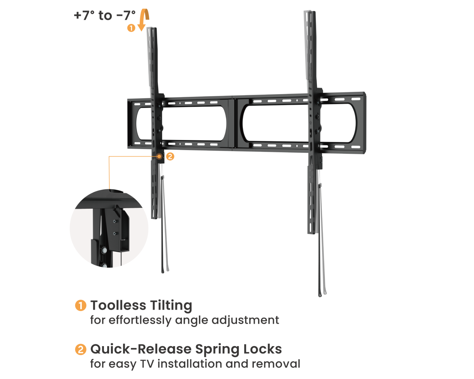Heavy-Duty Fast Vægmontering til TV 37"-140" er en vægmonteringsløsning fra MaxMount designet til tunge og store skærme. Den klarer vægte op til 125 kg og er kompatibel med TV-apparater op til 140 tommer, hvilket gør den velegnet til både privat og kommerciel brug. Med fokus på holdbarhed og brugervenlighed tilbyder dette produkt funktioner, der letter installation og justering af TV'et.Vægmonteringens robuste konstruktion sikrer stabilitet og sikkerhed, hvilket gør den til en pålidelig løsning selv for de største skærme. Den smarte split-design gør det muligt at pakke enheden i en mindre emballage, hvilket er praktisk for e-handel. Installationen lettes af den værktøjsfri tilt-funktion, hvilket giver brugeren mulighed for nemt at justere vinklen på TV'et. En innovativ hurtigkobling gør det nemt at installere og demontere enheden.