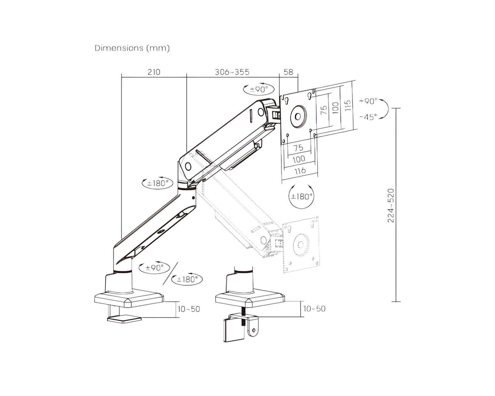 | Drejningsområde | +90°~-90° |
