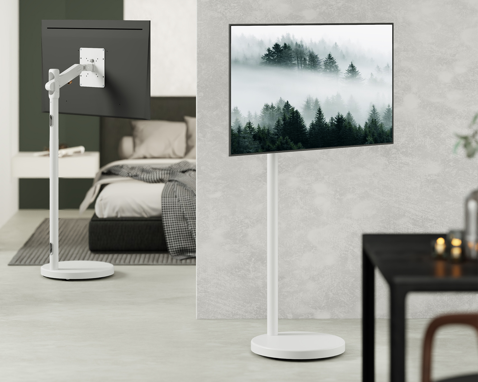 Golvstativ til TV fra MaxMount, som tilbyder optimal fleksibilitet til både kontor- og hjemmebrug. Med støtte for skærme i størrelsen mellem 17 og 43 tommer og en maksimal belastning på 17 kg pr. skærm, er det et alsidigt alternativ for alle, der søger en stabil og justerbar løsning. Den justerbare fjederarm gør det nemt at tilpasse højde og hældning for at opnå den perfekte betragtningsvinkel.Stativet er fremstillet af materialer af høj kvalitet som plastik og aluminium, hvilket sikrer både holdbarhed og lav vægt. Med målbevidst design integreret i konstruktionen inkluderer det desuden integreret kabelhåndtering, som holder kablerne organiserede og skjulte. Dette giver et rent og professionelt udseende, hvilket er særligt vigtigt i arbejdsmiljøer. Dens store rotationsmuligheder mellem +180° og -180° og hældning på +75° til -45° gør det muligt at tilpasse sig forskellige betragtningsvinkler. Skjulte hjul under stativet gør det nemt at flytte det uden at gå på kompromis med stabiliteten.