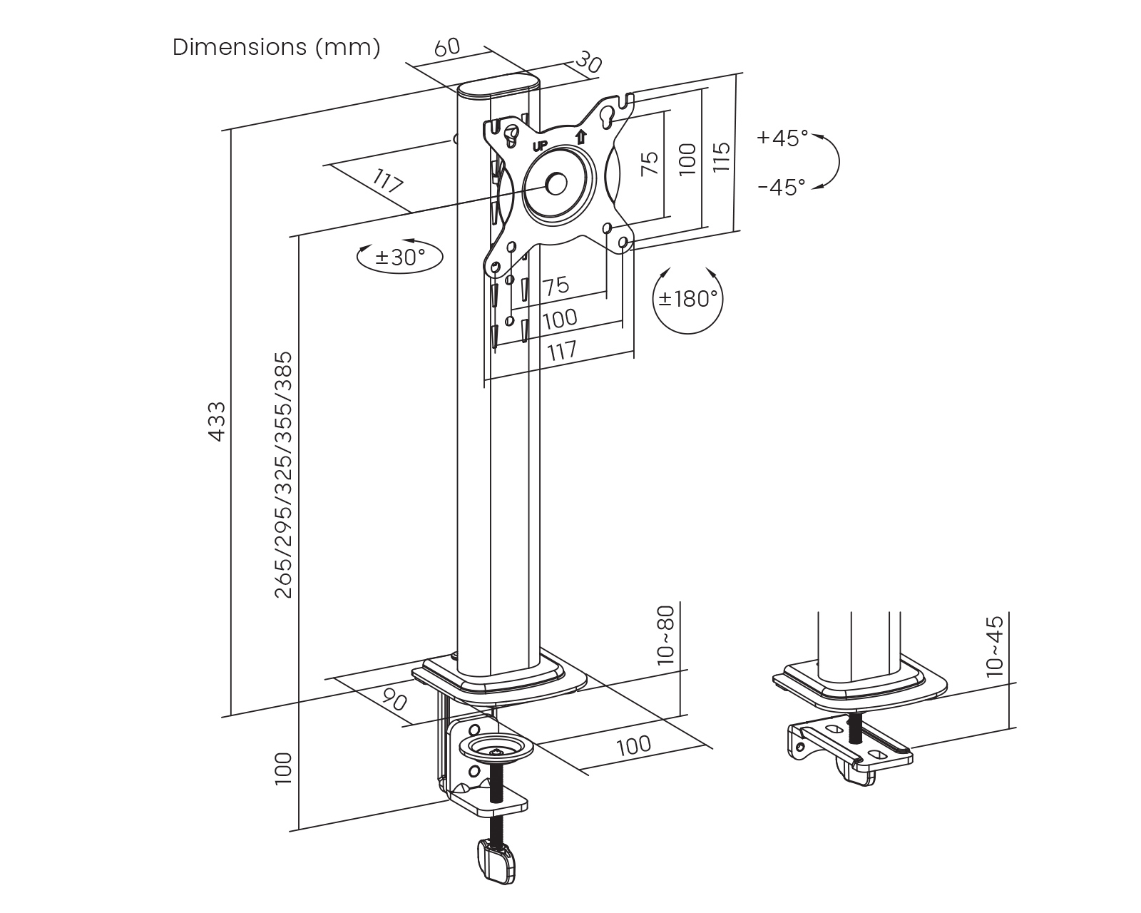 | Drejningsområde | +30°~-30° |