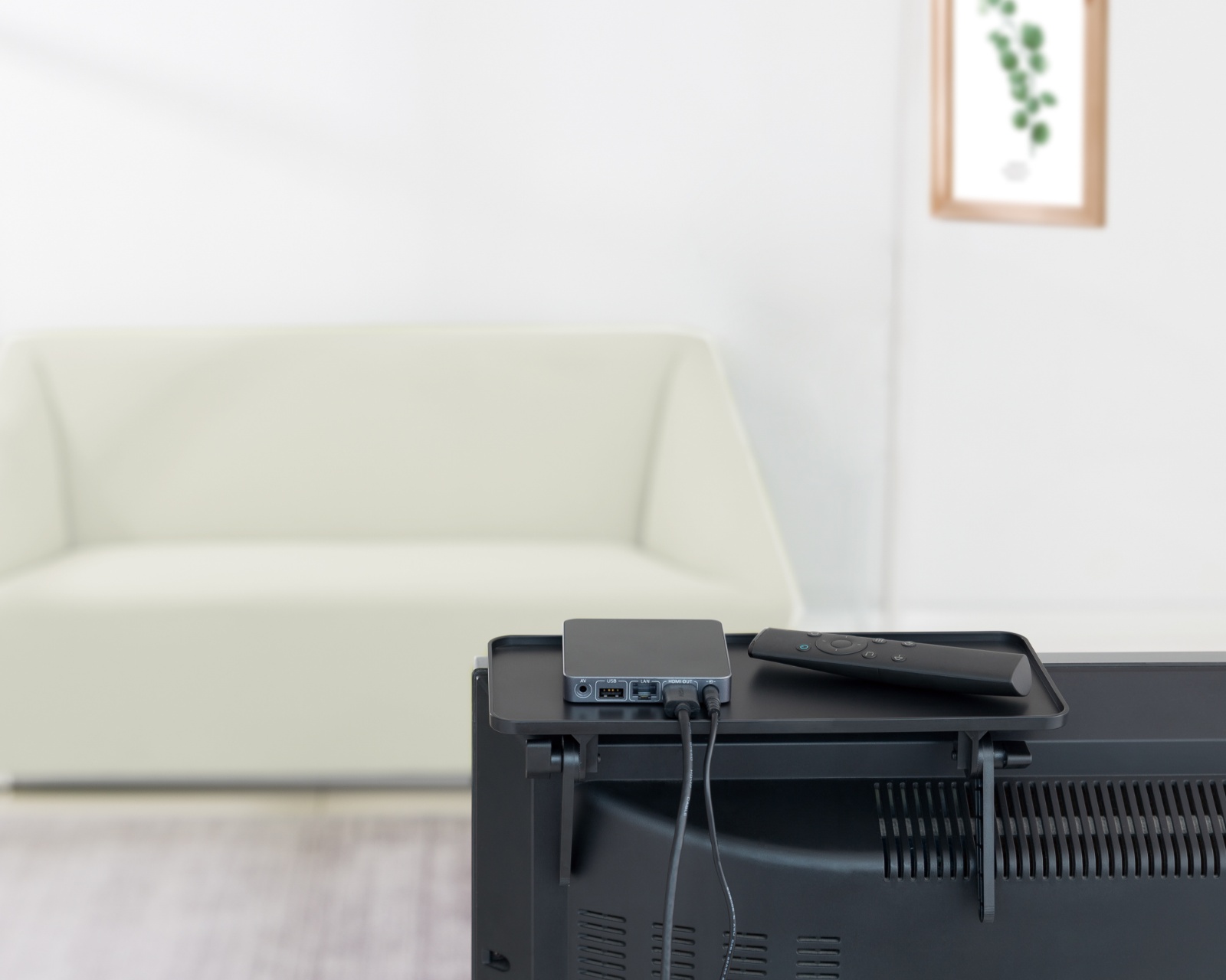 Toppmonteret mediehylde til TV fra MaxMount er en løsning til effektiv placering af medieenheder ovenpå TV-apparater. Hylden er konstrueret til at være kompatibel med TV-modeller, der har en tykkelse på over 18 mm, og tilbyder en afstand fra væggen på mere end 127 mm. Produktet har en holdekapacitet på op til 6 kg, og målene 300 mm x 127 mm giver rigeligt med plads til fjernbetjeninger og mediabokse.De beskyttende kanter rundt om hylden forhindrer genstande i at falde af, hvilket bidrager til et organiseret og sikkert miljø for dine medierelaterede apparater. Den letmonterede design og den praktiske lås gør det nemt at installere hylden, hvilket sparer tid og forenkler brugen. Med en sort overflade passer hylden ind i de fleste hjem-og kontormiljøer, hvilket gør den ideel til gamere og entusiaster, der værdsætter både funktion og æstetik.