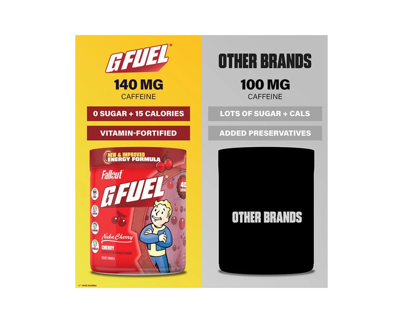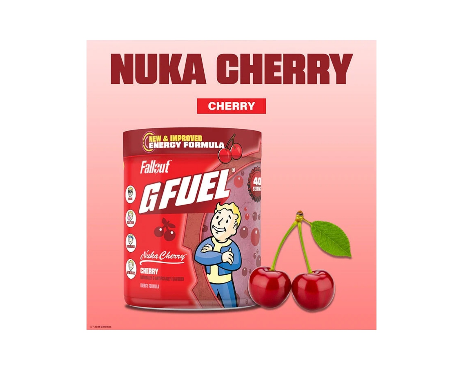 Nuka Cherry fra G FUEL, som tilbyder en unik smag af kirsebær. Produktet indeholder 40 portioner med 140 mg koffein pr. servering. Drikken er sukkerfri og fri for unødvendige fyldstoffer.En energidrik som Nuka Cherry er designet til at maksimere fokus og udholdenhed i spil og andre aktiviteter. Med den forbedrede formel 2.0 inkluderer denne drik antioxidanter og ingredienser, der støtter både krop og sind for at klare post-apokalyptiske udfordringer.