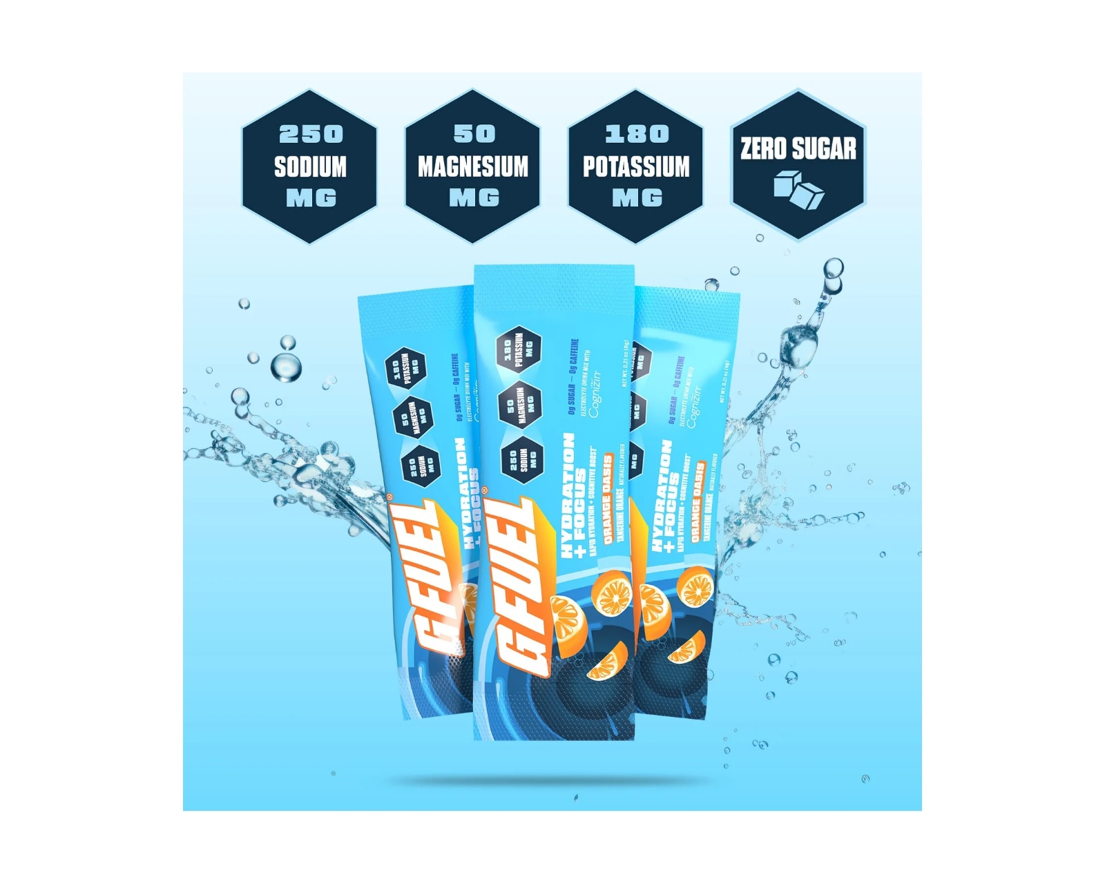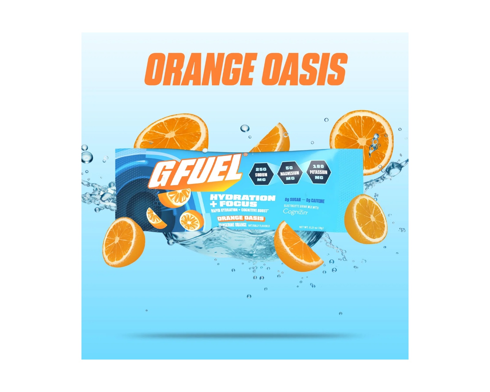 Orange Oasis Hydration + Focus Pack er et elektrolytpulverprodukt fra G Fuel, designet til øjeblikkelig hydrering og fokus. Med en unik blanding af elektrolytter og nootropiske stoffer, er dette pulver sukkerfrit og tilbyder en smag af orange oase. Hver pakke indeholder 20 portioner, hvilket gør den passende til brug i forskellige udendørs aktiviteter eller under træning og spil.Det avancerede elektrolytpulver indeholder en velafbalanceret sammensætning af fem nøgleelektrolytter for at støtte optimal hydrering og mental klarhed. Hver portion giver 250 mg natrium, 50 mg magnesium og 180 mg kalium, hvilket bidrager til hurtig rehydrering uden en salt eftersmag. Pulveret indeholder også Cognizin for at støtte opmærksomhed og hukommelse. Orange Oasis har et lavt kalorieindhold på kun 15 kalorier pr. portion.