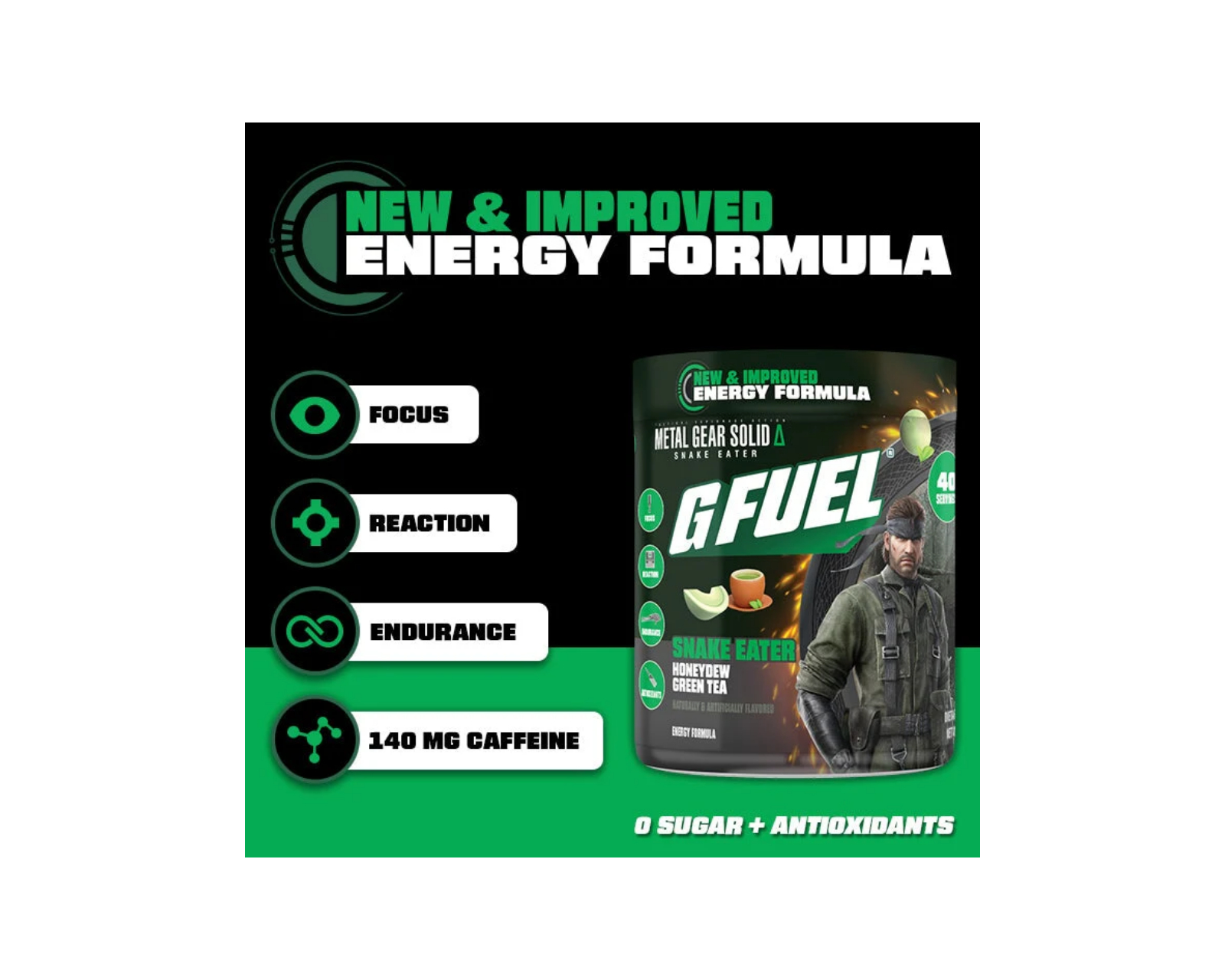 Snake Eater fra G FUEL, som kombinerer en forfriskende smag af Honeydew grøn te. Den tilbyder 40 portioner og har et koffeinniveau på 140 mg pr. servering, hvilket giver den støtte, du har brug for, for at klare intense sessioner.Produktet er designet til at give et stabilt energikick uden tilsat sukker, hvilket har til formål at støtte både koncentration og udholdenhed. Med en smagsprofil, der kombinerer sødmen fra citronade med en subtil tone af iste, er den designet til at give en frisk og opkvikkende oplevelse.