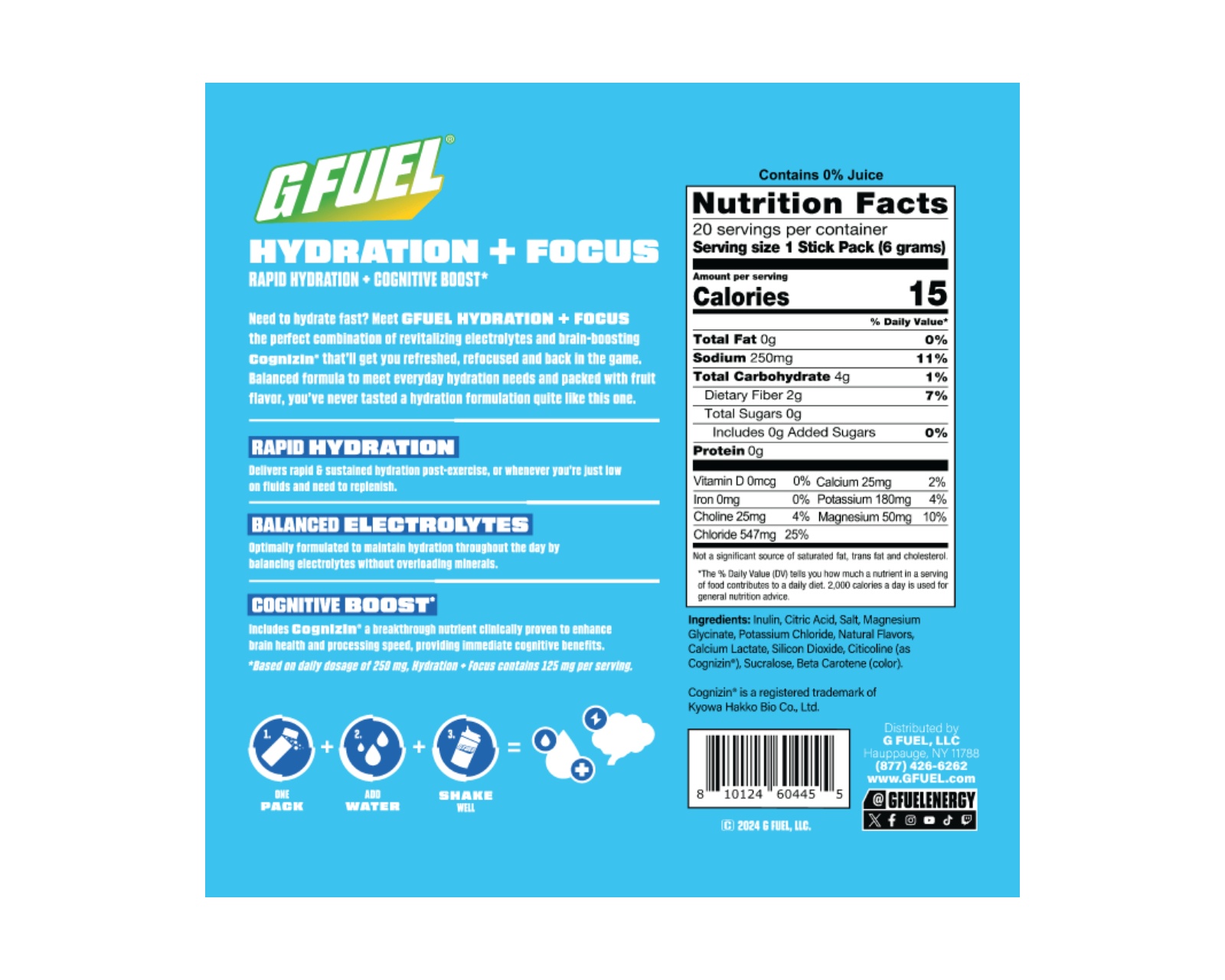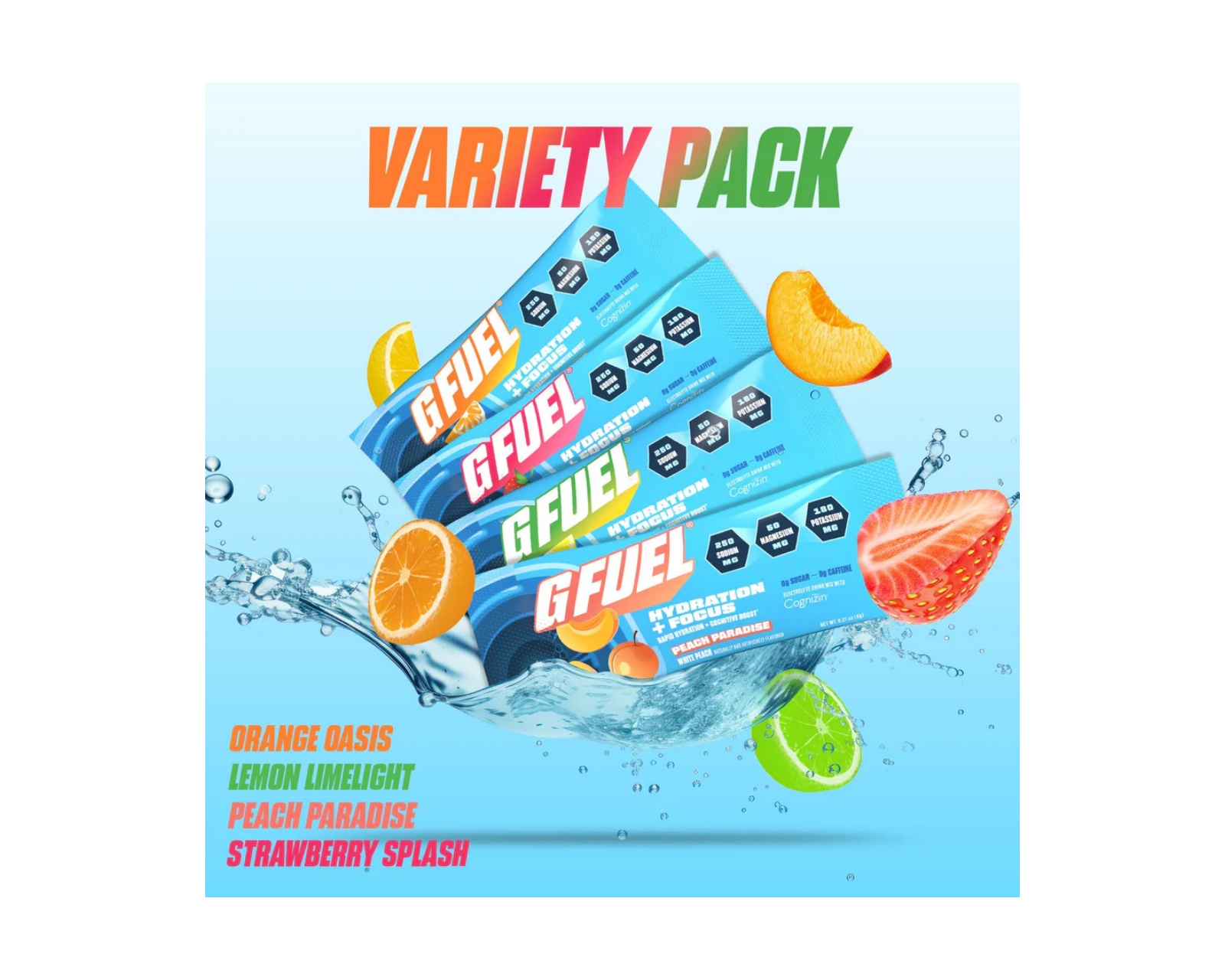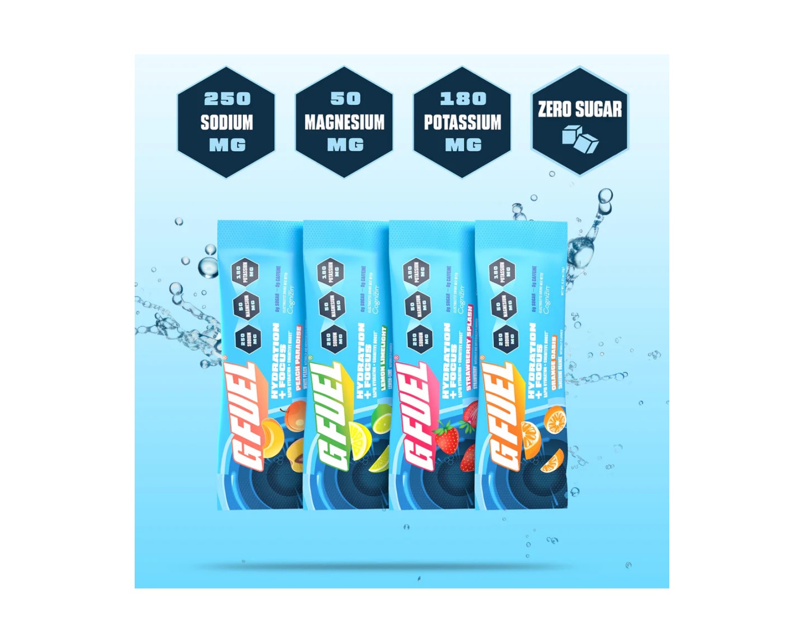 Variation pakken Hydration + Focus Pack er et elektrolypulver fra G FUEL, som tilbyder hurtig rehydrering og støtte til mental fokus. Det indeholder en blanding af fem vigtige elektrolytter med specifikationen 250 mg natrium, 50 mg magnesium og 180 mg kalium pr. portion. Produktet er beregnet til gamere, atleter og professionelle, der kræver både fysisk og mental præstation.Den nøje udformede formel af elektrolypulveret inkluderer også Cognizin, et klinisk studeret nootropisk stof, der fremmer hjernefunktion og mental klarhed. Pulveret er sukkerfrit og har kun 15 kalorier pr. portion, hvilket muliggør en ren rehydratiseringsoplevelse uden en saltet eftersmag. Hydration + Focus Pack fås i fire smagsvarianter: citron, fersken, jordbær og appelsin. Hver portionspakke blandes nemt med vand, hvilket gør den perfekt til træning, rejser eller intensive arbejdsdage.