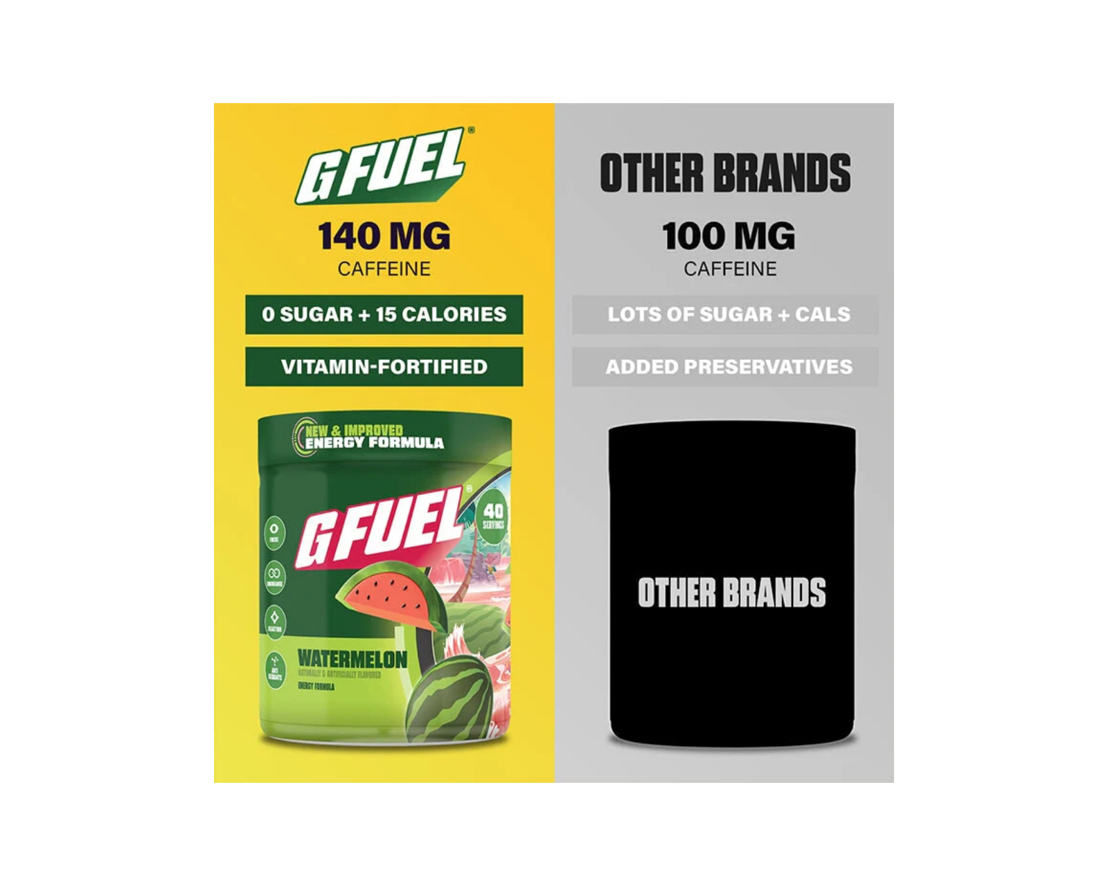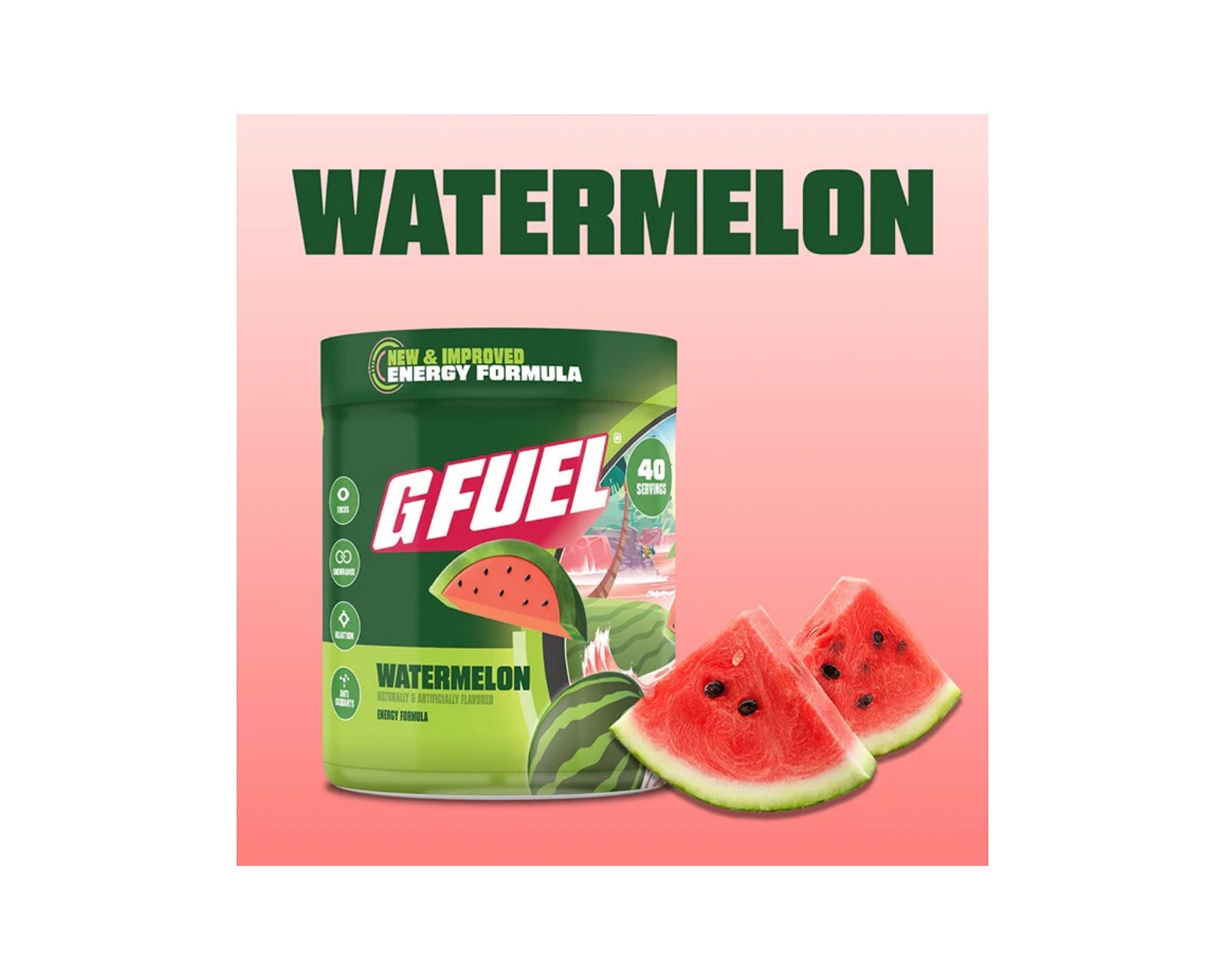 Watermelon 2.0 fra G FUEL, som tilbyder en smag af vandmelon med 40 portioner. Indeholder 140 mg koffein pr. portion. Designet til at være fri for tilsat sukker.Vandmelon 2.0 kombinerer en forfriskende smag med et afbalanceret koffeinboost, hvilket gør den ideel til aktive brugere, der søger efter en velsmagende hydrering. Med hele 40 portioner pr. pakke kan du nyde denne lækre drik uden at bekymre dig om at løbe tør for smag.