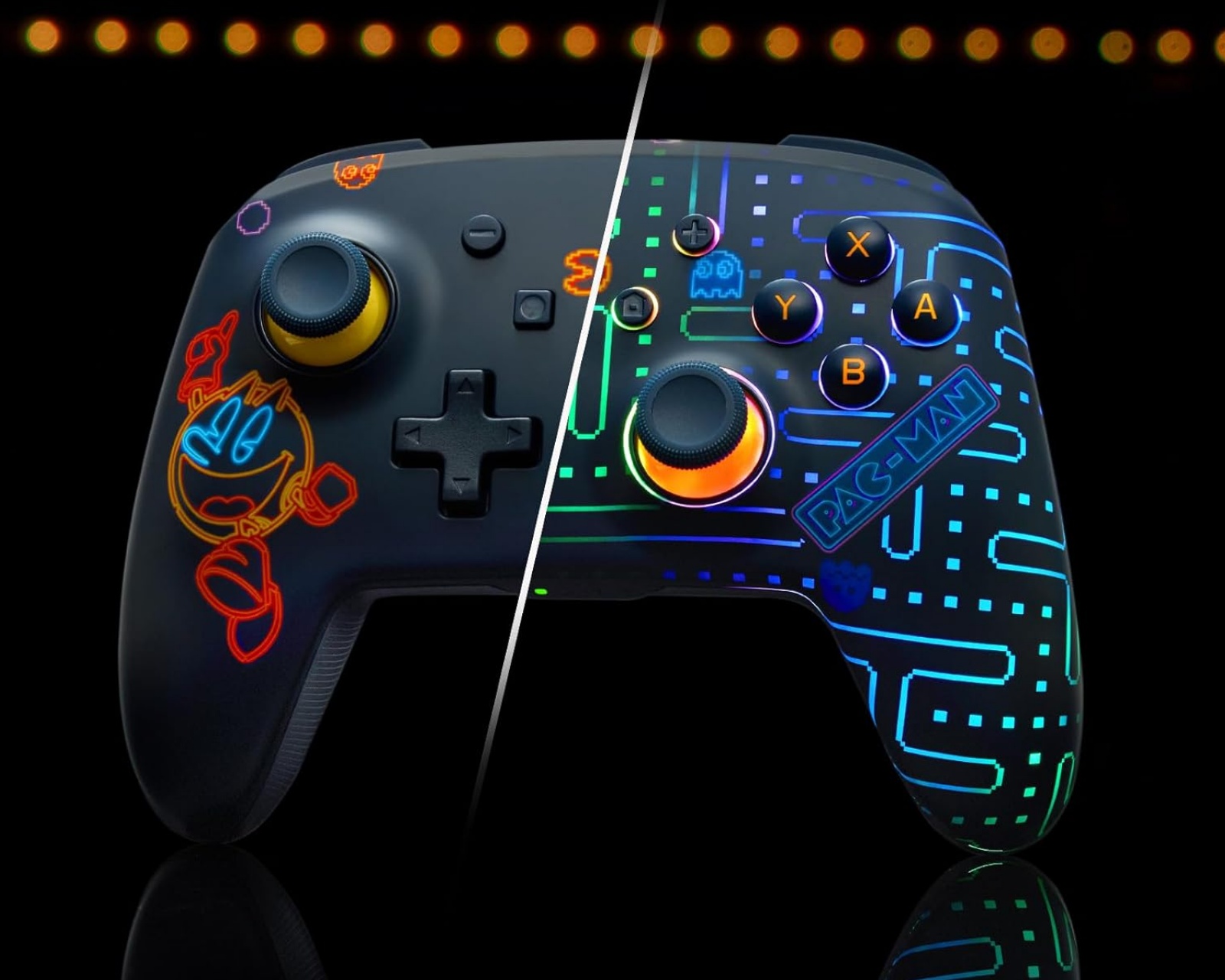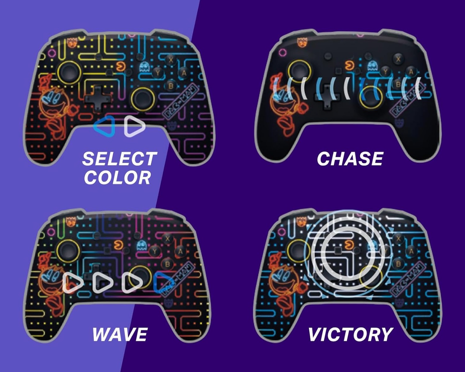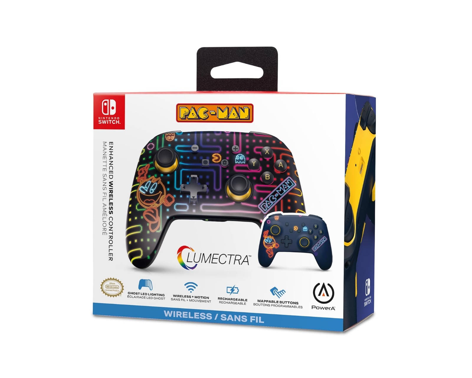 Forbedret Trådløs Controller til Nintendo Switch - Pac Man (Neon Arcade) er en spilcontroller fra PowerA, designet til brug med Nintendo Switch, Nintendo Switch OLED Model og Nintendo Switch Lite. Controlleren har en indbygget RGB LED-belysning, der fremhæver et skjult PAC-MAN-mønster og har fire unikke lysindstillinger. Derudover tilbyder den avancerede spilknapper, der kan programmeres under spillets gang for forbedret ydeevne.Controlleren er udstyret med et genopladeligt batteri, der giver op til 10 timers spilletid på en enkelt opladning. Den medfølgende USB-C-kabel er 3 meter lang, hvilket muliggør samtidig spil og opladning. Takket være det trådløse system kan brugeren spille frit på sin konsol. Controlleren har også bevægelsessensorer for mere responsiv spilkontrol og intuitiv navigation i spillet. Den ergonomiske design inkluderer en velkendt layout med tekstureret greb på bagsiden og teksturerede analoge stik.