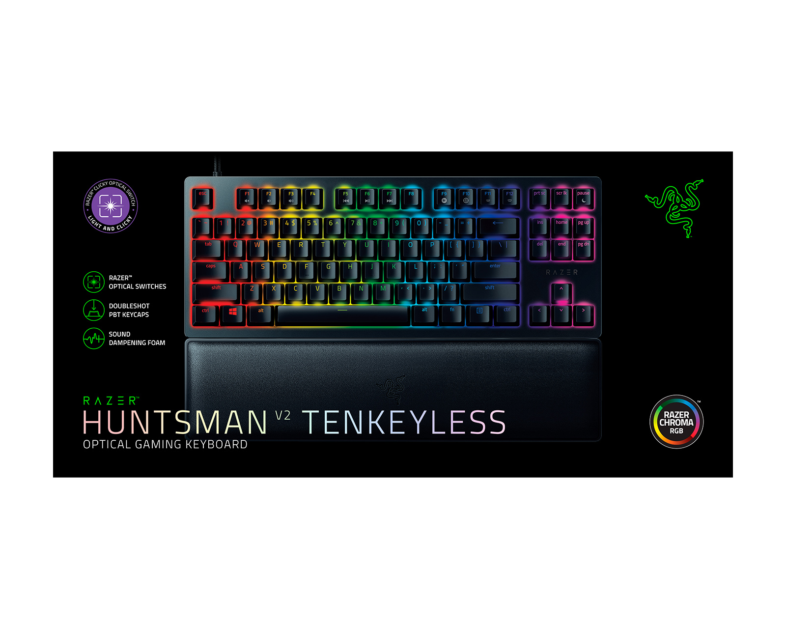 DEMO: Genkøb og testkopier. God stand.Huntsman V2 Tenkeyless Gaming Keyboard fra Razer er et højkvalitets tastatur specielt designet til de mest dedikerede gamere. Den er udstyret med Razer Optical Switches, der giver minimal inputlag og er designet til at modstå 100 millioner tastetryk.