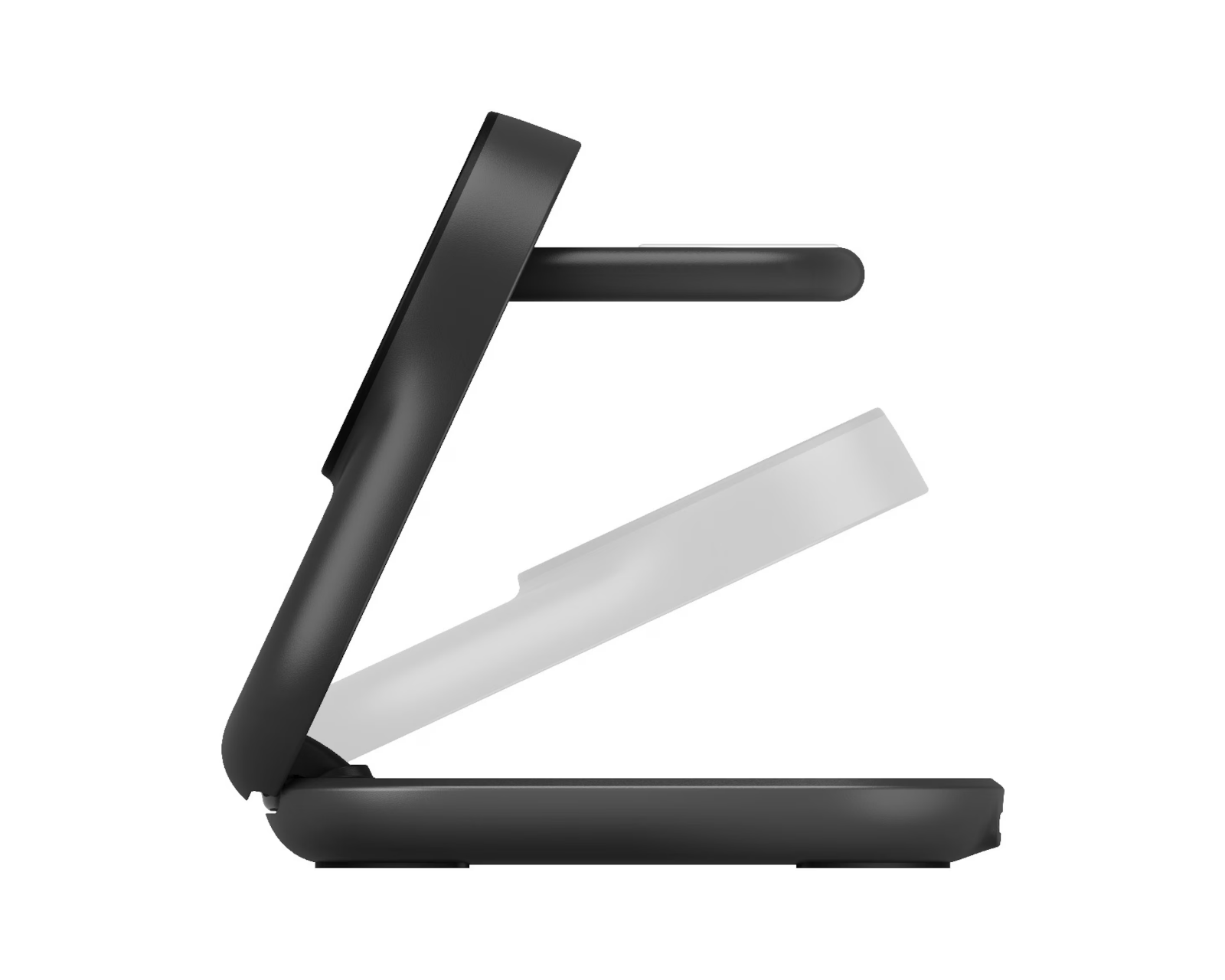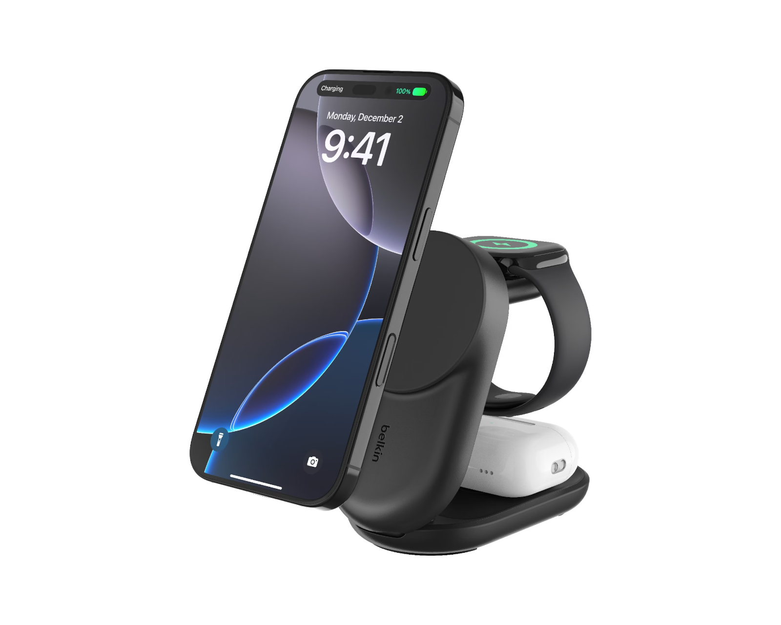 UltraCharge 3-i-1 Qi2 trådløs oplader er en trådløs oplader fra Belkin, der tilbyder omfattende opladningsmuligheder. Med en maksimal styrke på 25 W og en USB-C-strømforsyning på op til 45 W er den designet til effektivt at oplade flere enheder samtidig. Opladeren har en kabellængde på 1,5 m og et sammenklappeligt, let design, der gør den ideel til både hjemmet og rejser.Enheden drives af Qi2-teknologi, hvilket muliggør hurtigere trådløs opladning. Med ChillBoost, en passiv køleteknik, reduceres varmeproduktionen under hurtigopladning, hvilket beskytter batteriet på dine enheder. Opladeren kan f.eks. oplade en iPhone fra 0-50 % på 29 minutter og et Apple Watch, serie 10, fra 0-80 % på 30 minutter. Den har også støtte til at oplade AirPods med en effekt på op til 5 W. Den skridsikre bund og den magnetiske snap-on-justering sikrer en stabil opladning og en justerbar vinkel til at vise enheden i både liggende og stående position.