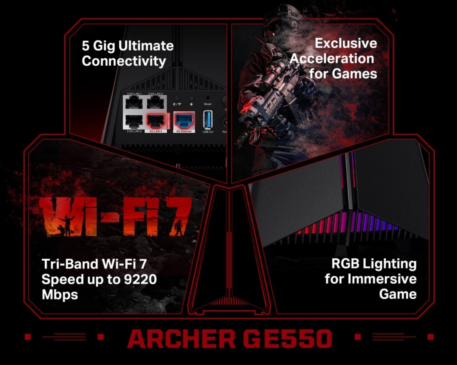 Archer GE550 er en tri-band Wi-Fi 7 gamingrouter fra TP-Link, specielt designet til at tilbyde ekstraordinære hastigheder op til 9220 Mbps. Med et 6 GHz-bånd, der leverer 5764 Mbps, et 5 GHz-bånd på 2882 Mbps og 574 Mbps på 2.4 GHz-båndet, er denne router designet til at holde spilsessionerne stabile og hurtige. Takket være dedikerede 5GHz-bånd til gaming, kan du nyde lav latens mens du samtidig streamer eller bruger andre enheder i hjemmet.En router af denne kaliber må have robuste interne komponenter, og Archer GE550 har en kraftfuld quad-core CPU, der maksimerer ydeevnen under intens gaming. Med support for Multi-Link Operation kan du bruge 5 GHz og 6 GHz samtidig, hvilket sikrer stabile forbindelser og hurtig dataoverførsel. Routerens tilslutningsmuligheder er også imponerende, med en 5 Gbps WAN-port og flere 2.5 Gbps LAN-porte, hvilket gør det muligt at tilslutte flere enheder samtidig uden at gå på kompromis med hastigheden. Denne router har også et dedikeret gamepanel til realtidsindsigt, hvilket letter strategisk gaming og giver en informativ oversigt over netværksstatus og ydeevne.