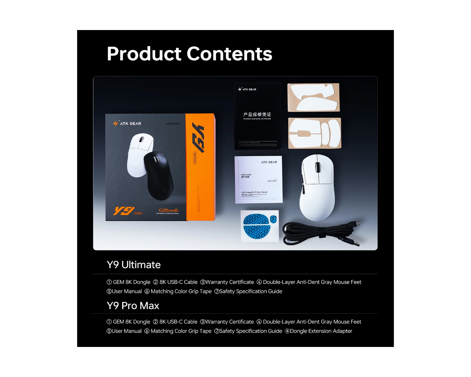 ATK Y9 Ultimate er en trådløs gamingmus fra ATK, som tilbyder et ergonomisk design for høj komfort ved længere anvendelse. Musen har en vægt på 55±2g og en justerbar polling rate mellem 125 og 8000Hz, hvilket gør den hurtigere reagerende under spil. Den er udstyret med en PAW3950 Ultra sensor for præcis sporing, hvilket er vigtigt for gamere, der kræver nøjagtighed.Musens konstruktion inkluderer en ny nano-coating, som ikke kun forbedrer grebet, men også forlænges holdbarheden. Den har en dimension på 125.6mm x 67.5mm x 43.3mm, hvilket gør den passende for de fleste håndstørrelser. ATK Y9 er specifikt designet til højtydende spil, hvor langvarig anvendelse og præcist udførelse er afgørende.