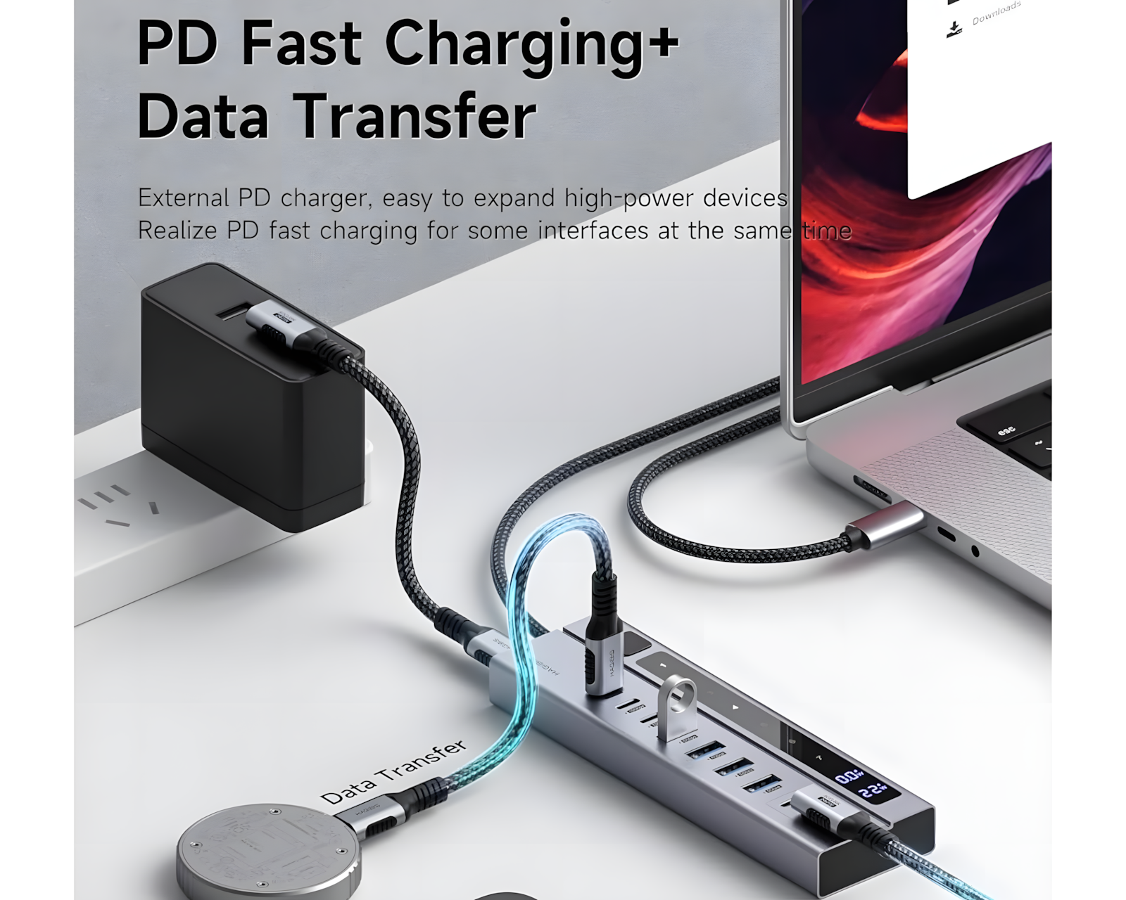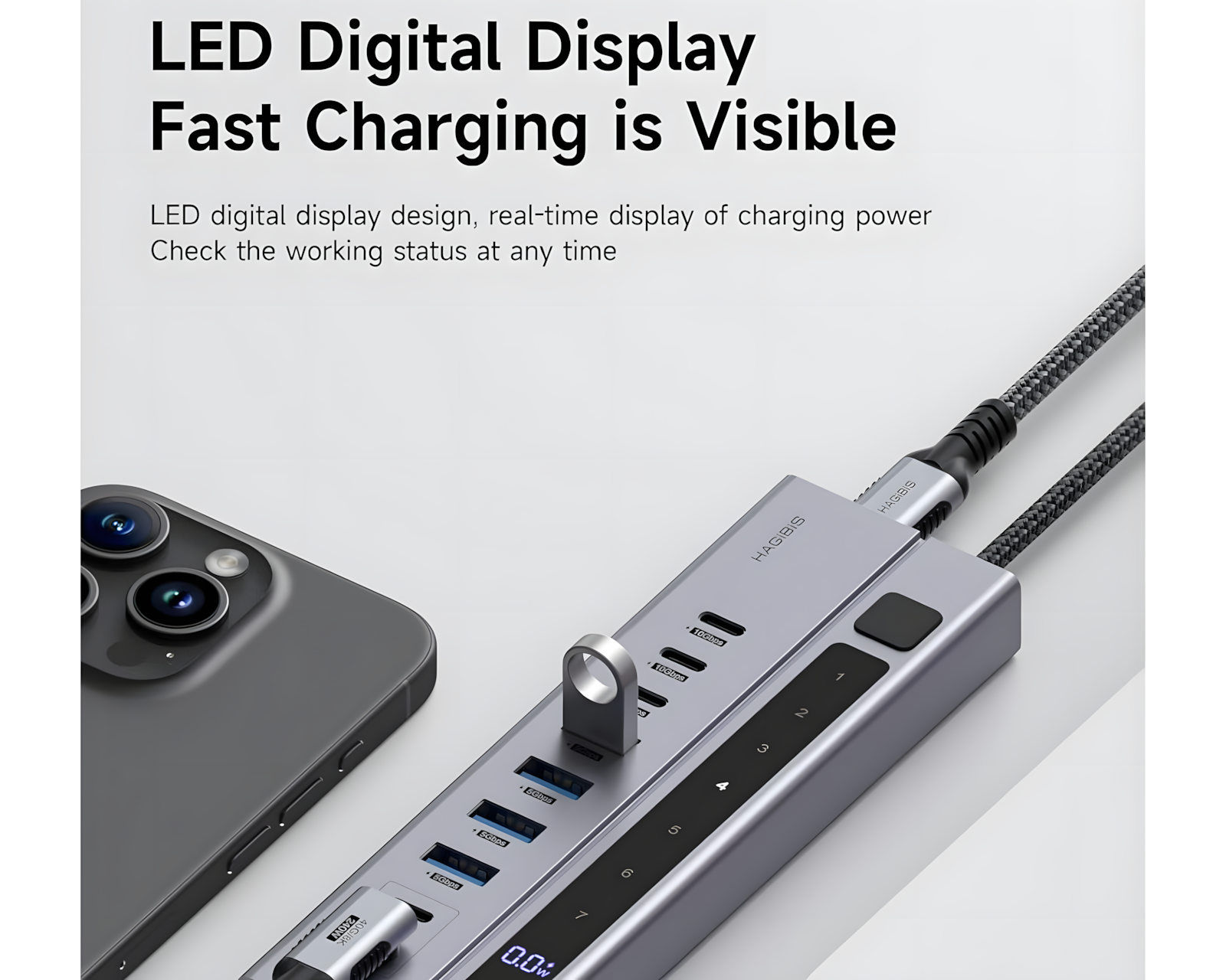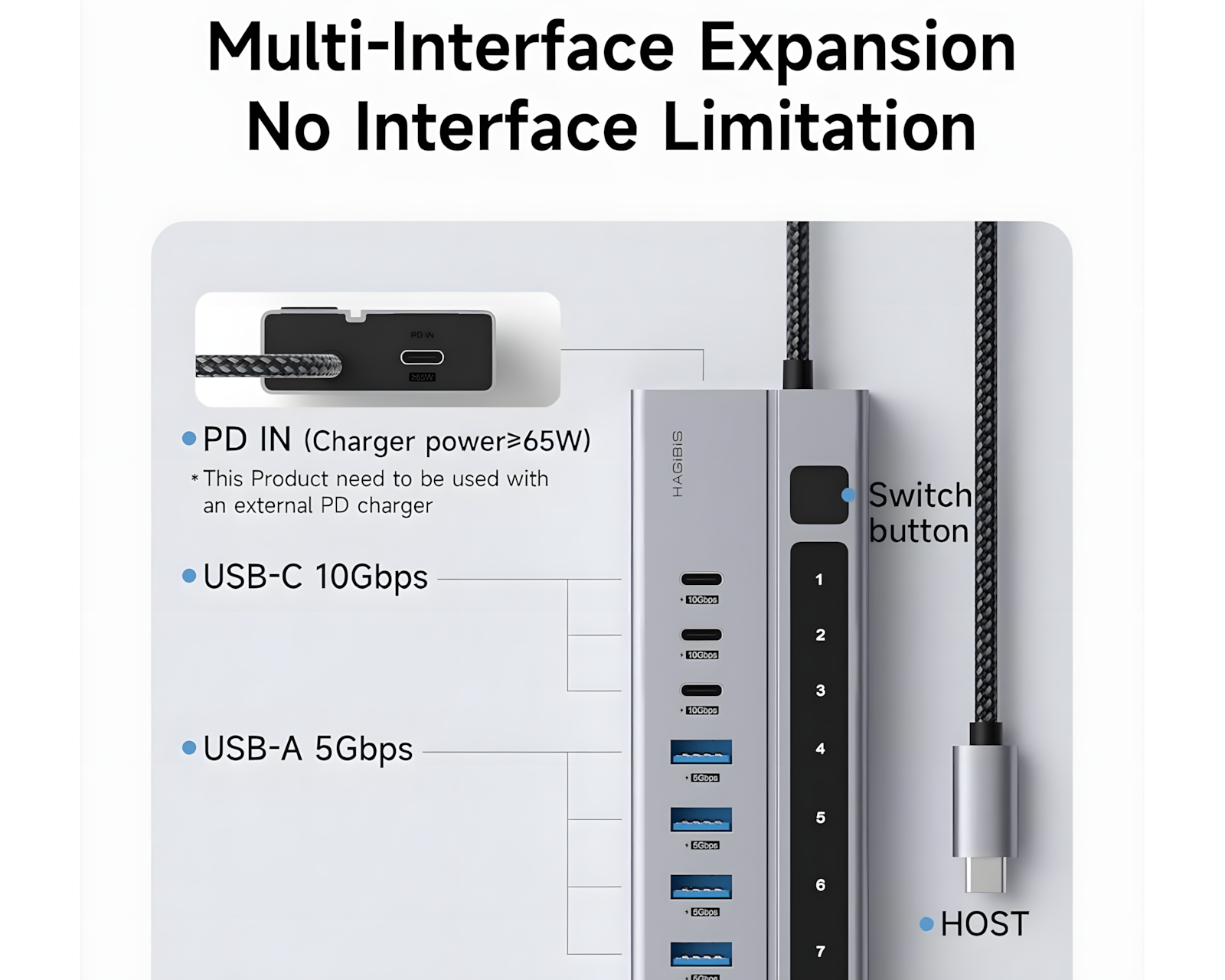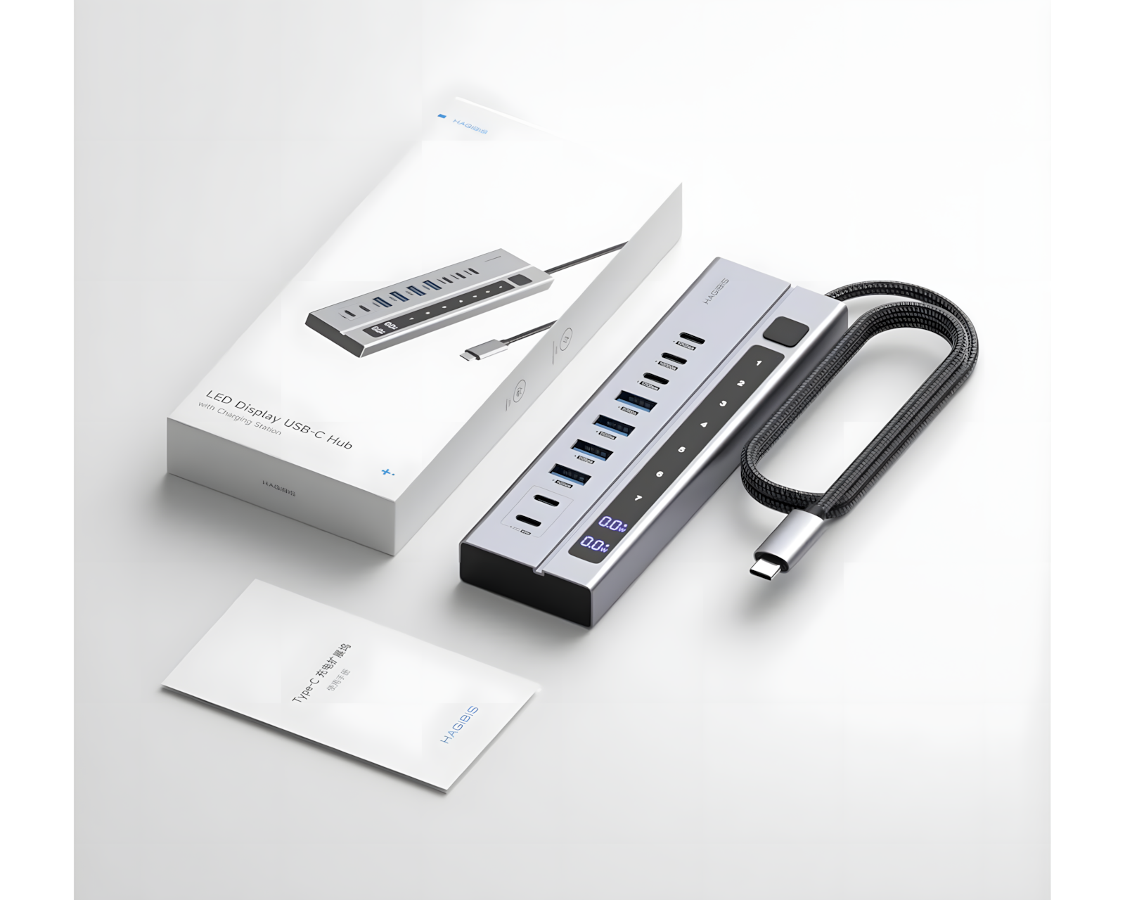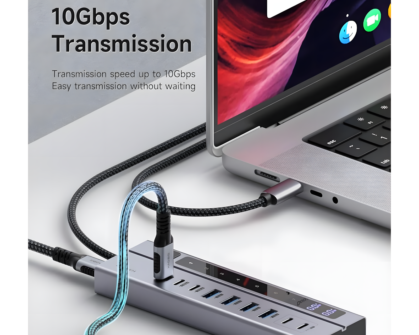 Hagibis USB C Hub er en 9-i-1 USB-C-dockingstation, der kombinerer forskellige tilslutningsmuligheder i en enhed. Den tilbyder tre USB-C 3.2 10Gbps-porte, fire USB-A 3.0 5Gbps-porte og to USB-C PD-opladerporte. Hubben er beregnet til brug med bærbare computere, stationære computere, spillekonsoller og andre enheder med USB-C-porte.Enheden er fremstillet af højkvalitets aluminium og inkluderer et holdbart flettet kabel på tre fod. Hubben har en strømafbryder, der kontrollerer alle porte, hvilket eliminerer behovet for at trække stik ud og tilslutte dem gentagne gange. USB-C-hubben kræver en ekstern PD-oplader med mindst 65W for at fungere. Opladningsstationen kan levere op til 45W til tilsluttede enheder, hvilket gør den nyttig til at oplade smartphones og tablets. Dataoverførselshastigheder op til 10Gbps for USB-C og 5Gbps for USB-A muliggør hurtig overførsel af filer.