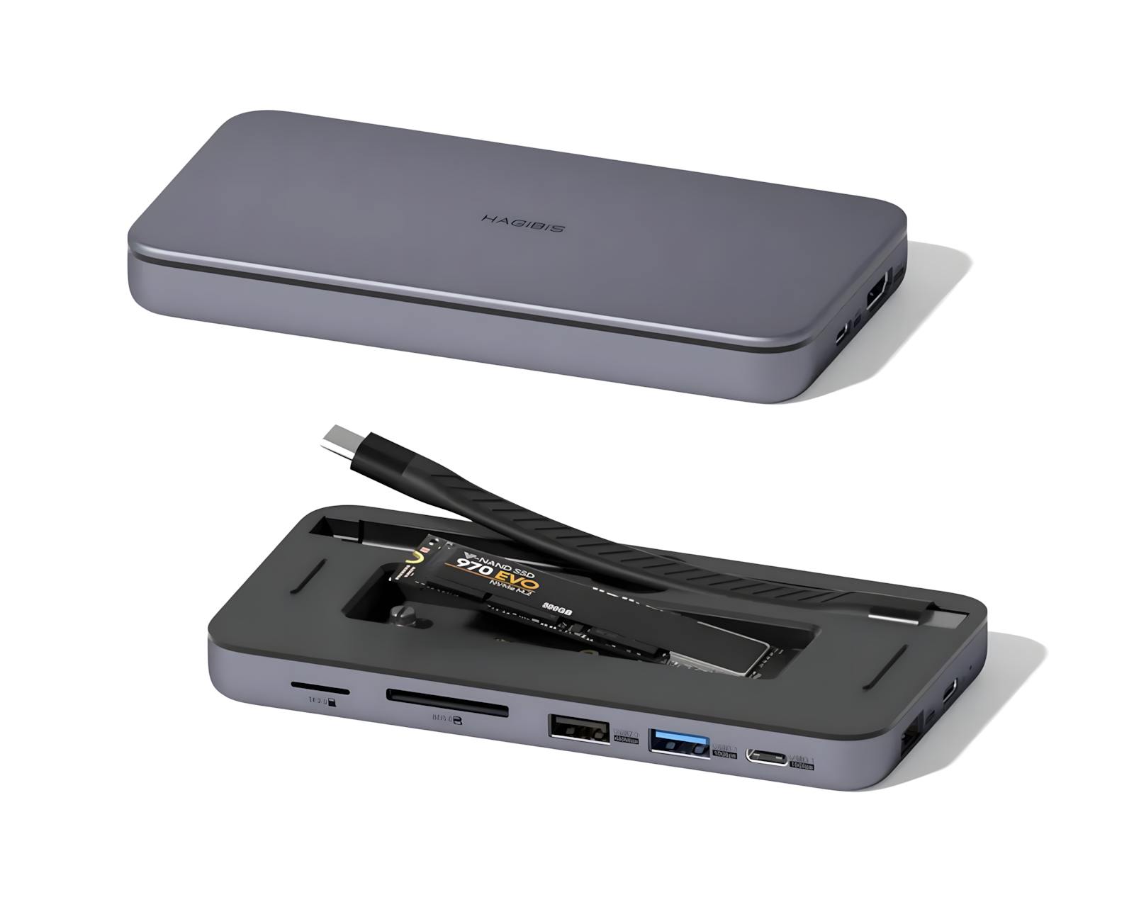 USB C Hub med harddiskkapsling er en dockingstation fra Hagibis, som kombinerer funktioner til lagerudvidelse og tilslutning af forskellige enheder. Den understøtter 2.5-tommer SATA-enheder, såsom SSD og HDD med en tykkelse på mindre end 15 mm. Med en teoretisk overførselshastighed på op til 5 Gbps kan en 1 GB-fil overføres på kun 2 sekunder. Adapterløsningen er designet til brugere, der har behov for at øge deres lagerplads og dataoverføringskapacitet.USB C Hub med harddiskkapsling er bygget til at give høj funktionalitet og ydeevne. Den har en TF/SD-kortplads og USB-porte for at muliggøre tilslutning af flere enheder samtidig. Den medfølgende dobbelte hovedkabel understøtter både USB C og USB A, hvilket giver bred kompatibilitet med forskellige systemer. Materialerne, der anvendes i konstruktionen, er valgt for stabilitet og holdbarhed under forskellige forhold. Denne hub muliggør en effektiv og smidig brug af enheder i både arbejds- og hjemmemiljøer.