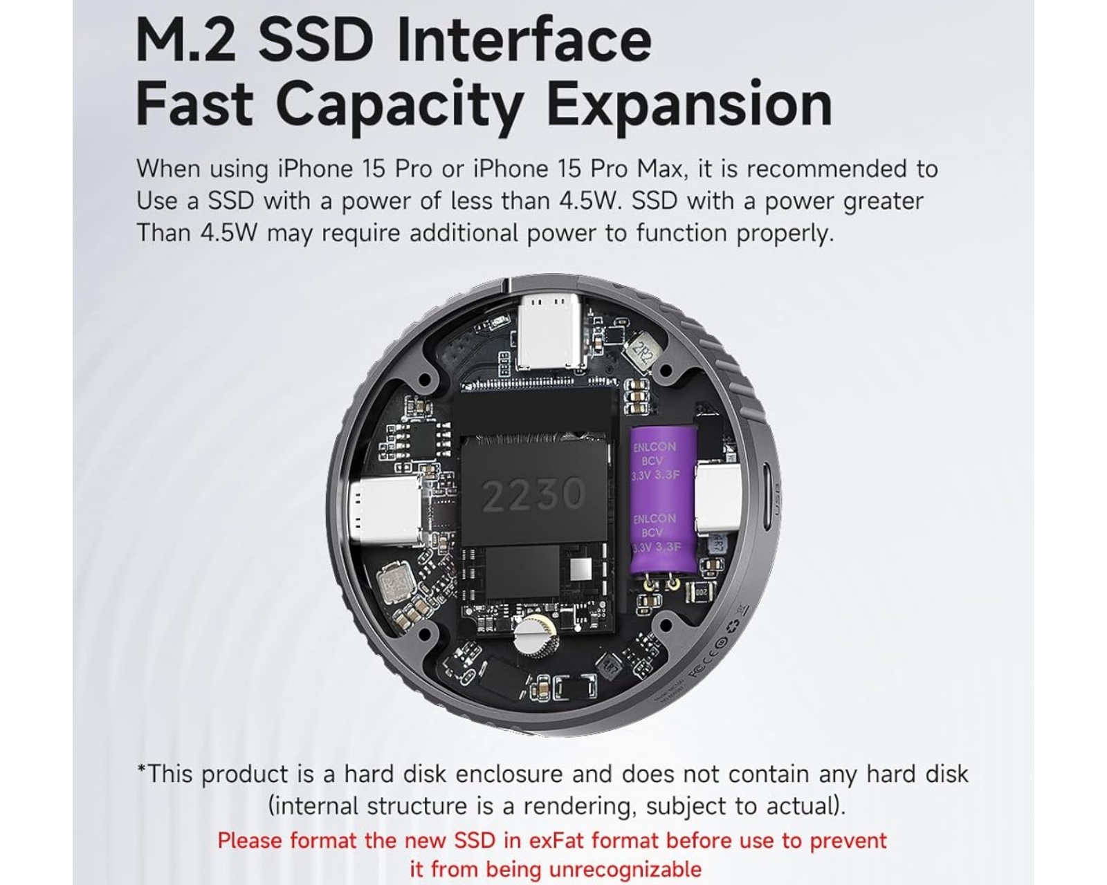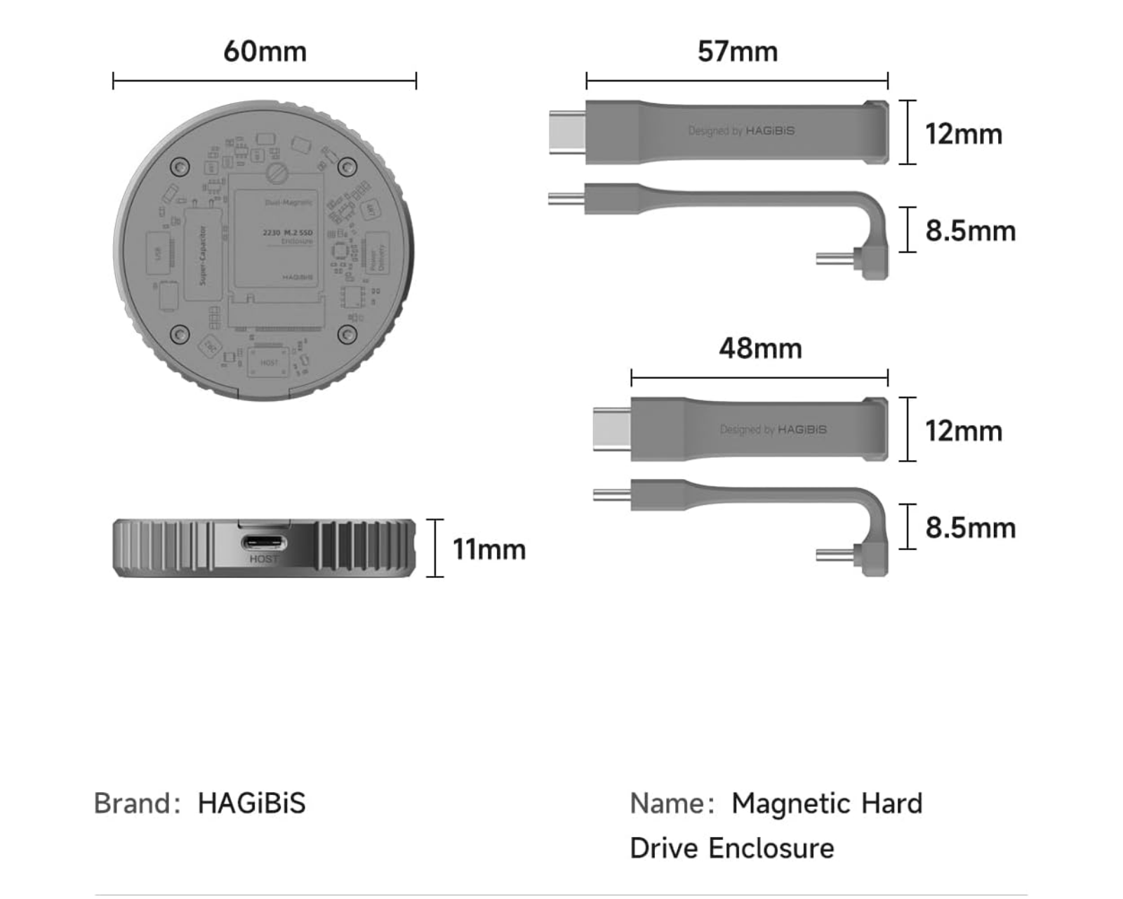 Hagibis M.2 2230 NVMe SSD-harddiskkabinettet er en aluminiumskonstruktion, der tilbyder beskyttelse og funktionalitet for NVMe SSD-enheder i formatet 2230. Det er specifikt designet til at understøtte enheder med M-Key og B+M-key, og giver en overførselshastighed på op til 10 Gbps med USB 3.2 Gen2. Dette harddiskkabinet har en integreret magnetisk struktur, der giver en sikker forbindelse med MagSafe, hvilket stabilt får det til at fastgøre sig til kompatible enheder. Det er beregnet til brug med blandt andet iPhone 15 Pro/Pro Max og andre enheder med USB Type-C-porte.Harddiskkabinettet er fremstillet af aluminium, hvilket giver god holdbarhed og varmeafledning for at optimere ydeevnen under brug. Derudover tilbyder det dobbelt beskyttelse mod strømafbrydelse med en superkondensator og en hovedkontrol, hvilket forlænget beskyttelsen af data under strømafbrydelser. Udstyret med to USB Type-C-kabler til dataoverførsel, er det kompatibelt med andre enheder, herunder MacBook og Android-telefoner. Det understøtter op til 2 TB kapacitet og tilbyder plug-and-play-brug uden kompliceret installation.