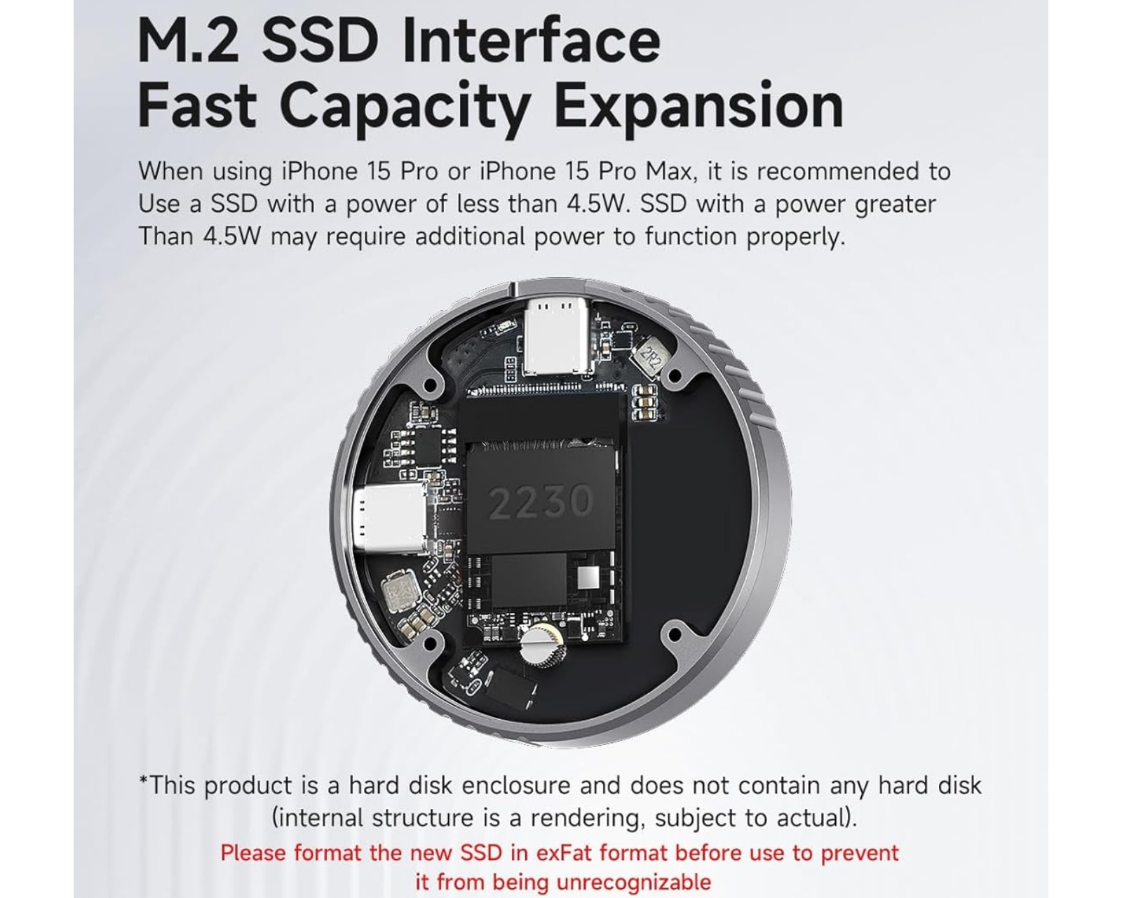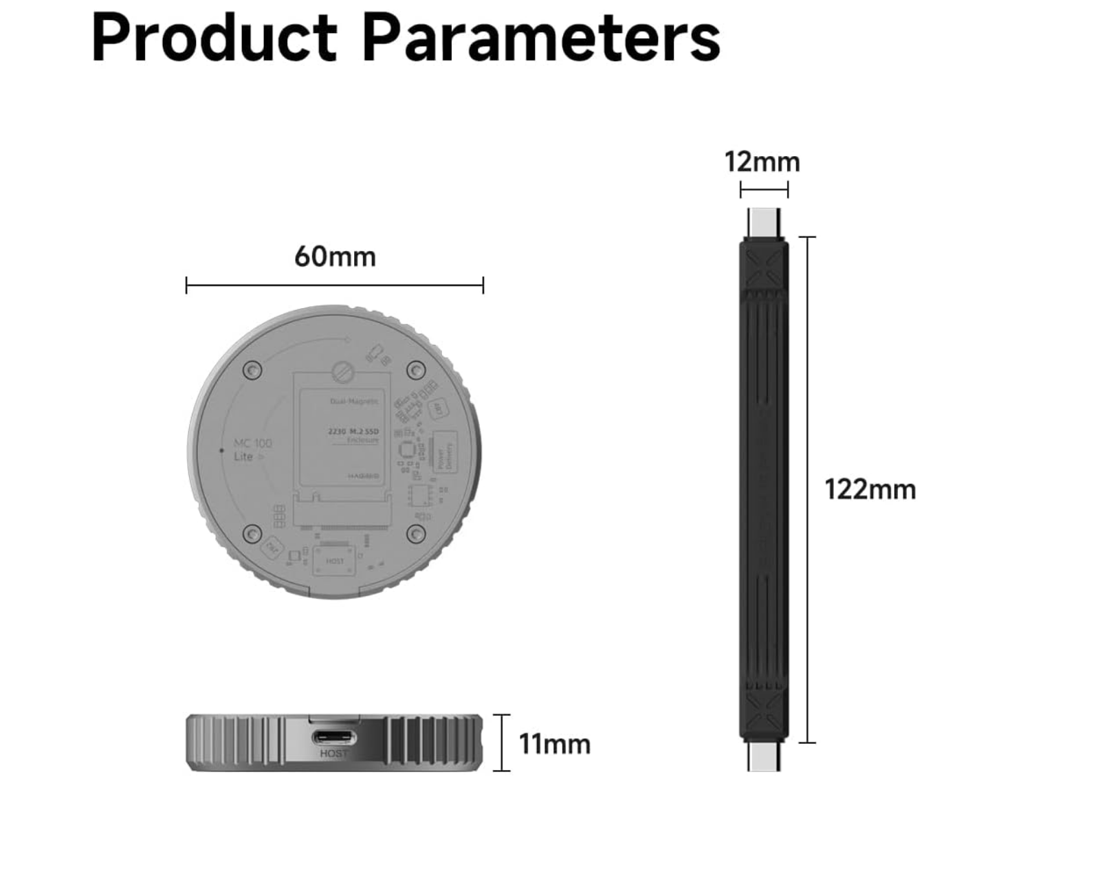 Hagibis USB C SSD Etui MC100 Lite er en ekstern M.2 2230 NVMe SSD-enhed, som muliggør en hurtig og effektiv lagringsløsning til forskellige enheder. Den understøtter USB 3.2 Gen2 med en hastighed på op til 10 Gbps, hvilket gør datatransmission hurtig og nem. Etuiet er bygget i aluminium og er designet til at være kompatibelt med en bred vifte af enheder, herunder smartphones og bærbare computere.Etuiet er kompatibelt med NVMe SSD-harddiske og har en indbygget magnetstruktur, der sikrer enheden ved brug med MagSafe-kompatible covers. Det tilbyder også direkte lagring af 4K ProRes-videoer til iPhone 17, 16, 15 Pro og Pro Max, hvilket eliminerer behovet for overførsel efter optagelse. Etuiet har desuden en smart strømstyring med dobbeltbeskyttelse mod strømafbrydelser, som beskytter data ved uforudsete afbrydelser.