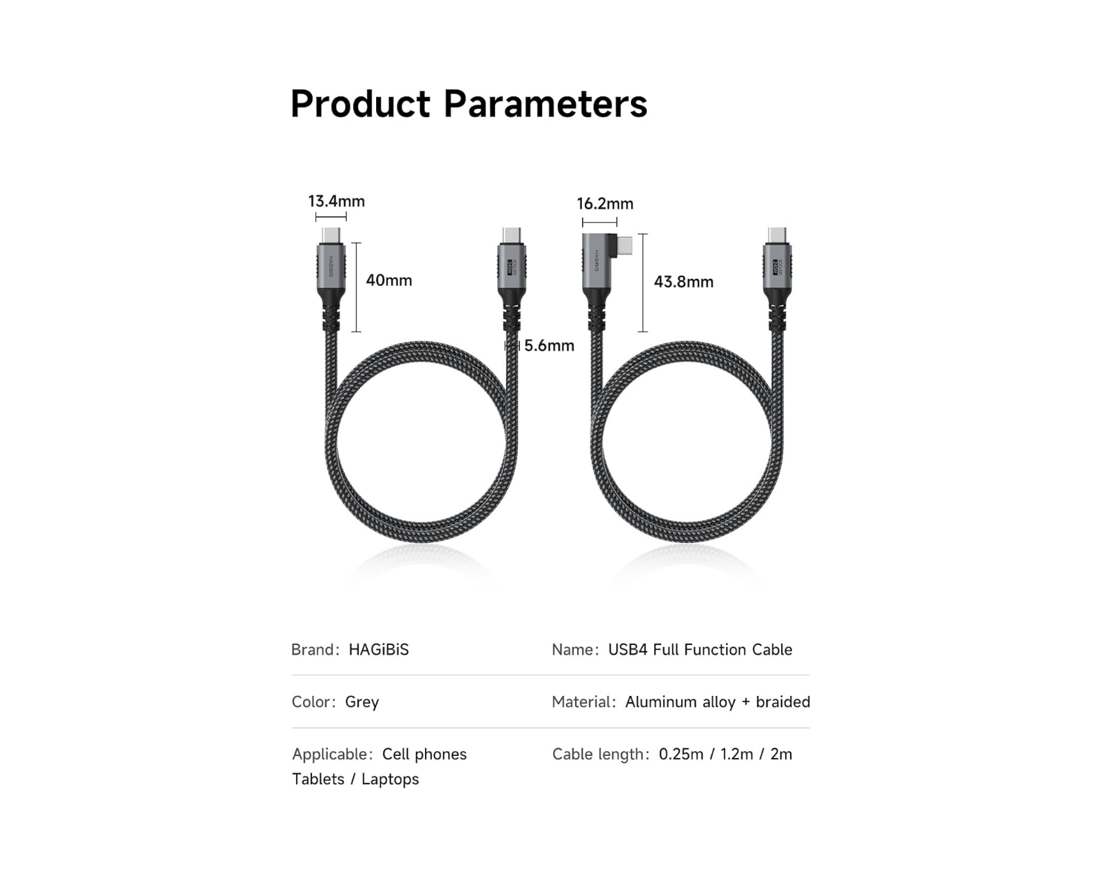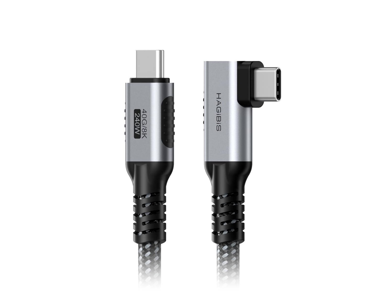 USB4 Kabel Sort - 1.2M er et datakabel fra Hagibis, der tilbyder højtydende funktioner til hurtig opladning og dataoverførsel. Kabelen understøtter 240W hurtig opladning i henhold til PD3.1-standarten, hvilket gør den nedadkompatibel med tidligere versioner, PD3.0 og PD2.0. Med en længde på 1,2 meter er den designet til at imødekomme behovene hos brugere af moderne enheder som mobiltelefoner, computere og spillekonsoller.Kabelen muliggør 8K/60Hz højopløst videosignaloverførsel via DisplayPort-protokollen, hvilket gør den ideel til gamere og professionelle brugere, der kræver høj billedkvalitet. Den har en dataoverførselshastighed på op til 40Gbps, hvilket gør, at store filer kan overføres på få sekunder. 90° bøjdesign gør, at den ikke blokerer hånden under brug, hvilket giver en bedre ergonomi.