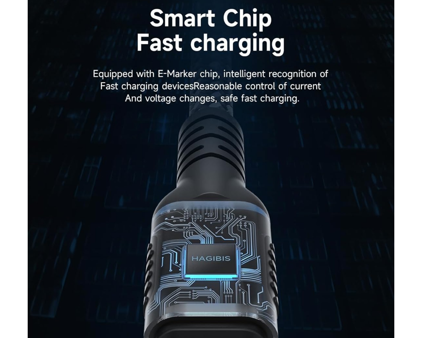 Den vævede tråd giver kabelen høj slidstyrke og modstandsdygtighed over for sammenfiltring takket være den tætte korsetvævning. Udstyret med en smart E-Marker-chip til hurtig opladning, som intelligent registrerer enheder og justerer strøm og spænding for sikker opladning, samt en blød og anti-interferens grafen-skærmning, der har høj elektrisk ledningsevne.